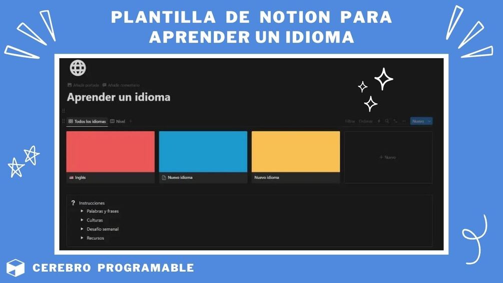 Si estás abrumado tratando de aprender un nuevo idioma, olvida la confusión y el desorden con la plantilla de Notion de CerebroProgramable. Esta herramienta te ayudará de la siguiente manera: