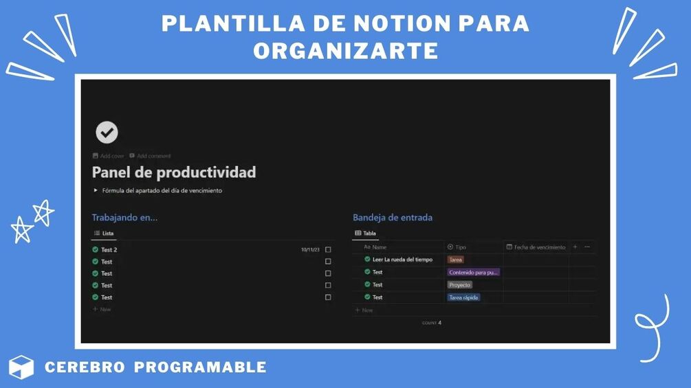 En CerebroProgramable, hemos creado una plantilla de Notion para organización personal que te ayudará de la siguiente manera: